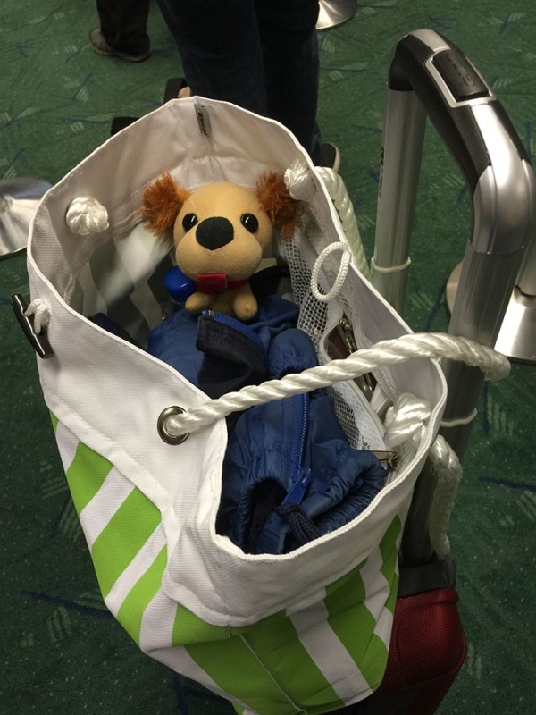 I seem to ride around in bags a lot when I’m with Mom. It gets me there but I don’t get to see much. Dad always has a backpack or camera bag and he zips me in with my head sticking out so I can see and make faces at people. Anyway… me in the bag on the suitcase. We are off to the airport. The plan is a quick flight to SFO then jump the red eye to DC.