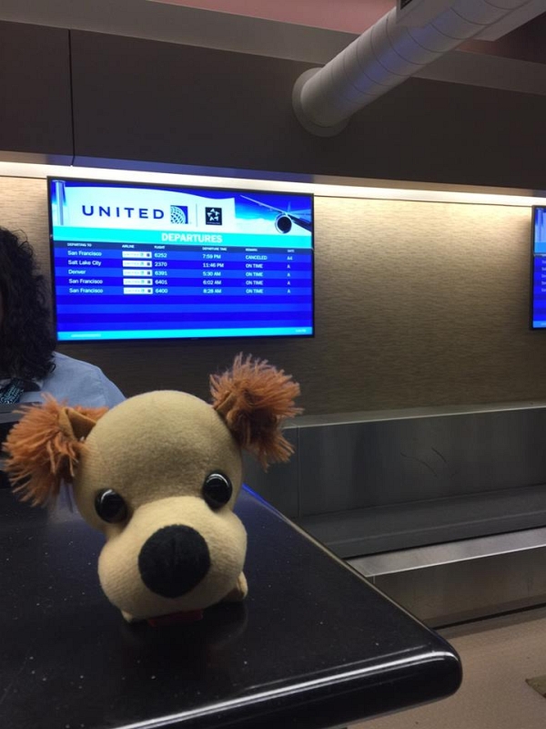Well this is NOT a good way to start things off. They said our flight was 3 hours late. That means a missed connection on the Frisco flight. Then things got worse because they CANCELED the flight all together. By now mom was a very unhappy camper and I was a very quiet little dog. She was talking to other passengers and people all dressed up in United Airline uniforms.They said no way were getting out until late the next afternoon at the soonest. She got them to rebook our flight to one out of Portland. Mom and another woman that was stuck rented a car and a way we went to catch an early Portland flight