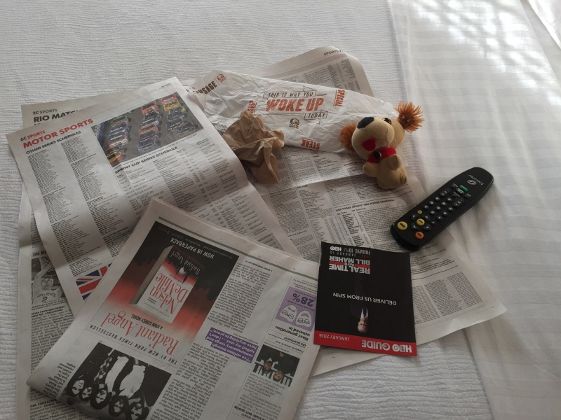 She was in no mood to be messed with when she said I was staying in the room that day. She left me food and water, the remote for the TV and the HBO guide and the paper to read and for other little dog uses.