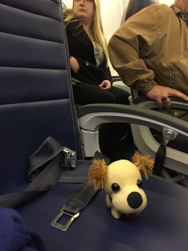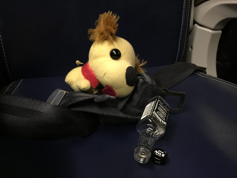 There was a little bit of Jack left in the bottle the flight attendant left so I sniffed that and got a few drops out of it. It doesn’t take much to konk out a dog that only weighs 2 ounces. I slept all the way home.